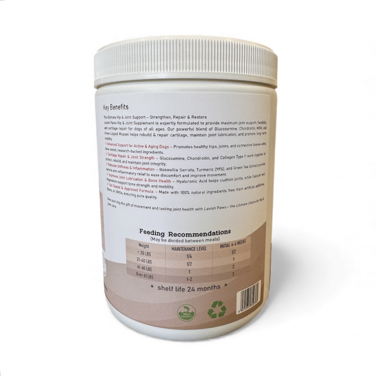 Lavish Paws Hip & Joint is now one of the most complete, well rounded joint supplements available. We improved the formula to deliver stronger cartilage support, deeper inflammation control, and better long-term mobility.